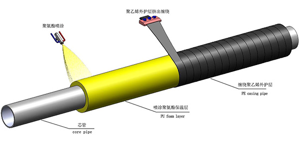 硬質聚氨酯噴塗聚乙烯纏繞預製蕾丝视频下载安装由輸送介質的工作鋼管(芯管)、聚氨酯硬質泡沫塑料保溫層及聚乙烯外護層組成。保溫層厚度和外護層厚度在生產時可以根據需要在一定範圍內任意調整。可根據集中供熱和供冷中介質的參數和實際的散熱損失所要求的保溫層厚度進行定量生產,滿足不同項目的需要。